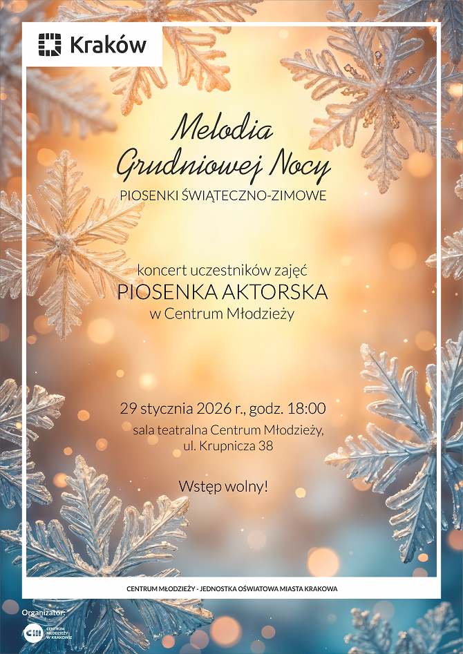 Zapraszamy młodzież do wzięcia udziału w MŁODZIEŻOWYCH PREZENTACJACH TEATRALNYCH "Teatr moich marzeń 2026". Kontynuując wieloletnią tradycję konkursu, zapraszamy młodych twórców do prezentacji własnych, autorskich realizacji. Tak jak w poprzednich edycjach, również w tym roku konkurs ma formułę otwartą — bez ograniczeń tematycznych i formalnych. Uczestnicy mogą zgłaszać m.in. krótkie adaptacje dramatów, montaże poetyckie, spektakle autorskie, a także formy inspirowane kabaretem lub teatrem piosenki. Jesienią 2025 roku, już po raz trzeci w CM zagościł projekt taneczny dla osób chorych na Parkinsona wg metody Dance for PD pod nazwą "PD Czyli Pójdź Dalej. Od edukacji do kreacji". Centrum Młodzieży jest jednym z miejsc, w którym odbywają się regularne, cotygodniowe lekcje tańca, mające charakter rehabilitacji i arteterapii. Projekt, którego beneficjentem jest Fundacja Milla, otrzymał dwuletnie dofinansowanie z Ministerstwa Kultury i Dziedzictwa Narodowego w ramach programu Edukacja kulturalna, dzięki czemu zajęcia dla Parkinsoników oraz ich bliskich i osób wspierających będą mogły odbywać się aż do czerwca 2026 roku. Centrum Młodzieży jako partner udostępnia uczestnikom swoje sale taneczne, wspiera też projekt promocyjnie i merytorycznie. Poza lekcjami stacjonarnymi projekt pozwolił na stworzenie na platformie Youtube darmowej bazy lekcji tańca dla chorych na Parkinsona, uzupełnianej w każdym kolejnym roku realizacji. Baza pozwala na samodzielną praktykę wg możliwości czasowych, poziomu, nastroju, umiejętności i potrzeb, precyzyjnie prowadząc uczestnika przez specjalnie skrojone ćwiczenia, sekwencje, a nawet choreografie. Do bazy została także zakomponowana i nagrana muzyka. Projekt jest wynikiem doświadczeń jego inicjatorki i koordynatorki Agaty Moląg oraz osób zrzeszonych w stowarzyszeniach dla chorych na Parkinsona rozsianych po całym kraju. Metoda Dance for PD dotarła do Polski dopiero pięć lat temu, choć na świecie znana jest prawie 30 lat. EDIT: z powodów niezależnych od Organizatora koncert "Melodia grudniowej nocy" zaplanowany na 29 stycznia nie odbędzie się. Przepraszamy! O ewentualnym nowym terminie będziemy Was informować. Pozostańmy jeszcze na moment w świątecznym, magicznym klimacie! Serdecznie zapraszamy na koncert "Melodia grudniowej nocy", podczas którego usłyszycie utwory świąteczne oraz zimowe w autorskich interpretacjach i nastrojowej odsłonie. Na scenie wystąpią uczestnicy naszych zajęć Piosenka Aktorska. Termin: 29 stycznia 2026 r. (czwartek), godz. 18.00 Wstęp wolny! Zapraszamy na XXVI edycję KONKURSU LITERACKIEGO I PLASTYCZNEGO DLA MŁODYCH POLAKÓW MIESZKAJĄCYCH POZA GRANICAMI KRAJU. W 2026 roku Polskie Radio obchodzi swoje 100-lecie. Od stu lat informuje, uczy, bawi i kształtuje gusta muzyczne kolejnych pokoleń Polaków – zarówno w kraju, jak i za granicą. Choć dziś radio konkuruje z telewizją i mediami cyfrowymi, wciąż pozostaje medium wyjątkowym, oferującym treści wysokiej jakości, różnorodne i dostępne dla odbiorców w każdym wieku. To właśnie radio, także w nowoczesnej, podcastowej formie, może być przestrzenią do dialogu, refleksji i opowiadania historii Polaków na całym świecie. Zbliża się kolejny finał Wielkiej Orkiestry Świątecznej Pomocy - to już w najbliższą niedzielę, 25 stycznia! https://allegro.pl/oferta/pobyt-dla-4-osob-w-cw-jordanova-sztab-wszib-18240078476 27 stycznia 2026 r. o godz. 18.00 zapraszamy na kolejny seans w ramach Dyskusyjnego Klubu Filmowego "Czas Apokalipsy" – wersja reżyserska. Rodziców, którzy rozglądają się za przedszkolem dla swojego maluszka, zapraszamy na Dzień Otwarty w naszej Akademii Twórczego Przedszkolaka! TERMIN: 21 stycznia 2026 r. (środa) | godz. 17:15-18:30 MIEJSCE: Centrum Młodzieży | ul. Krupnicza 38 (II piętro) ZGŁOSZENIA do 19 stycznia br.: tel. 12 430 00 15 wew. 245, e-mail: atp@cmjordan.krakow.pl Akademia Twórczego Przedszkolaka w Centrum Młodzieży im. dr. H. Jordana - świetna alternatywa dla klasycznego przedszkola - to całodzienny blok zajęć edukacyjno-artystycznych dla dzieci w wieku 3-5 lat, z opieką i pełnym wyżywieniem, od poniedziałku do piątku w godz. 7:30-17:00. UWAGA: rekrutacja do Akademii Twórczego Przedszkolaka będzie się odbywać w czerwcu br. Startuje tegoroczna edycja projektu „ZŁAP ODDECH W GÓRACH!”, skierowanego do uczniów i uczennic szkół podstawowych i średnich z Krakowa. Inicjatywa powstała z myślą o tym, by uczestnicy mogli choć na chwilę zmienić otoczenie, odpocząć od miejskiego zgiełku i odetchnąć w otoczeniu pięknej, górskiej przyrody. Zapraszamy zatem na „zieloną szkołę” do Centrum Wypoczynku JordaNova (filia nr 2 Centrum Młodzieży im. dr. H. Jordana w Krakowie). To piękne miejsce w Beskidzie Sądeckim (Gołkowice Górne niedaleko Starego Sącza), położone w pięciohektarowym lesie sosnowo-modrzewiowym, z górskim potokiem. Klimatyczna i urokliwa okolica sprzyjają ładowaniu akumulatorów o każdej porze roku. 19 stycznia br. od godz. 8:00 rozpoczynamy zapisy na turnusy zielonych szkół w lutym i marcu br. Zapisy odbywają się wyłącznie za pośrednictwem poczty elektronicznej, na adres e-mail: zielonaszkola@cmjordan.krakow.pl. Decyduje kolejność zgłoszeń! Wszystkie szczegóły dot. programu i zapisów są zamieszczone poniżej. Serdecznie zapraszamy nauczycieli wraz z uczniami do udziału w krakowskich obchodach 163. rocznicy wybuchu Powstania Styczniowego. Serdecznie zapraszamy na Koncert Kolęd i Pastorałek w wykonaniu Zespołu Pieśni i Tańca „Małe Słowianki”. EDIT: Brak wolnych miejsc. Wstęp na wydarzenie jest wolny! Zapraszamy uczniów i uczennice z Krakowa i województwa małopolskiego do udziału w konkursie plastycznym i fotograficznym "SZTUKA LUDOWA MAŁOPOLSKI". 17 grudnia (środa) w godz. 9:00-12:00 zapraszamy na coroczny Przegląd Małych Form Teatralnych JA