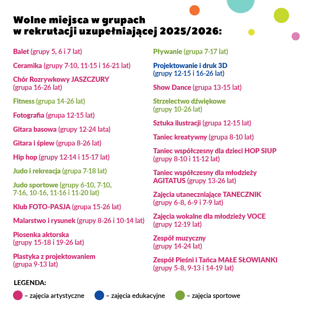 W dniach 11-25 sierpnia 2025 r. rozpoczyna się drugi etap naboru na zajęcia stałe w roku szkolnym 2025/26, czyli REKRUTACJA UZUPEŁNIAJĄCA - składanie wniosków o przyjęcie na wolne miejsca w grupach.