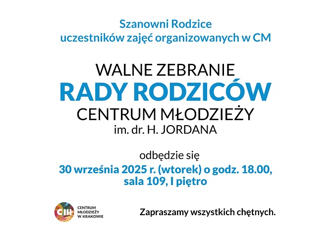 30 września br. (wtorek) o godzinie 18.00 w sali 109 w budynku CM przy ul. Krupniczej 38 odbędzie się walne zebranie Rady Rodziców Centrum Młodzieży.