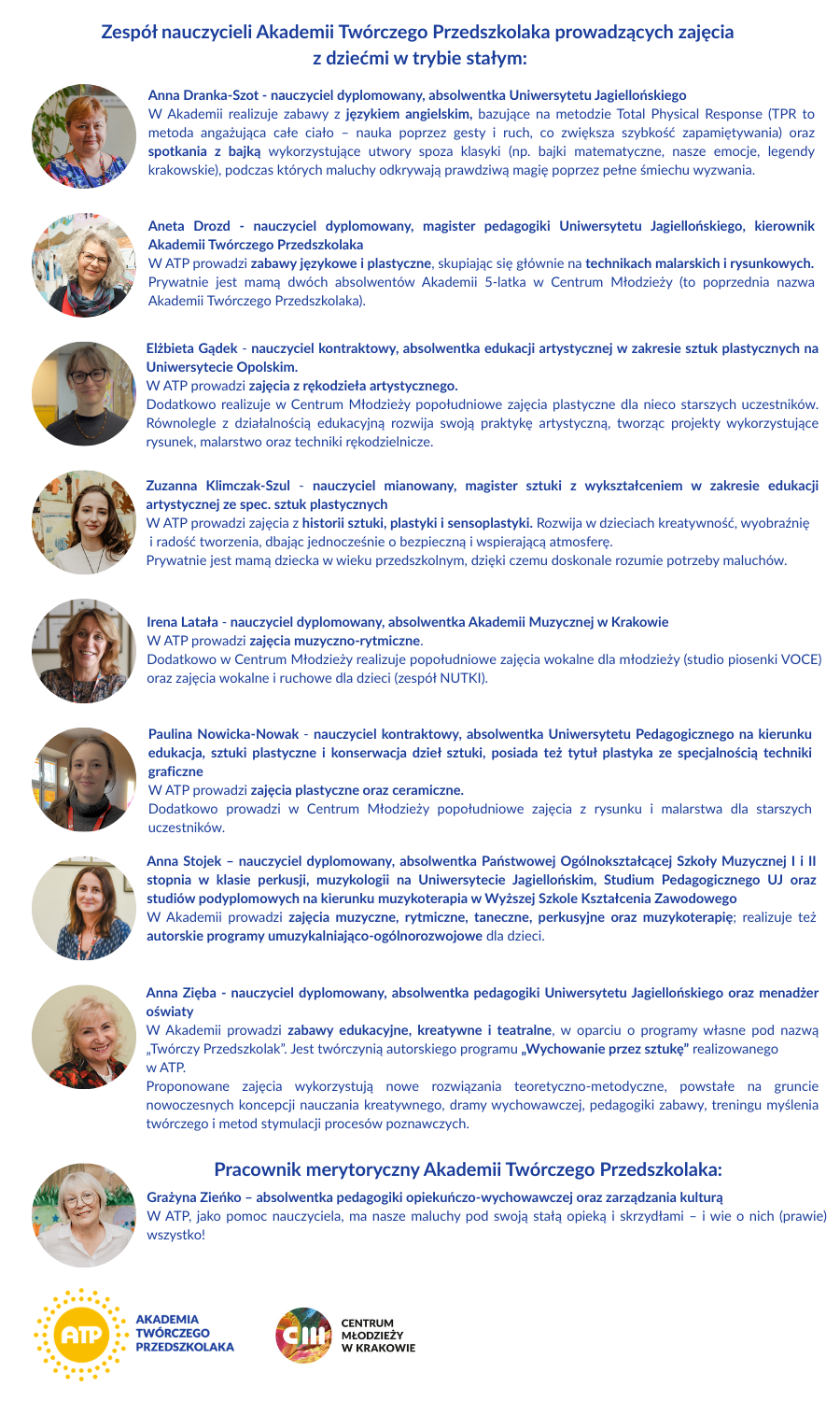 Aby zapewnić uczestnikom wszechstronny i harmonijny rozwój oraz troskliwą opiekę, zajęcia prowadzi stały zespół wykwalifikowanych nauczycieli z bogatym doświadczeniem pedagogicznym, o różnych specjalnościach.